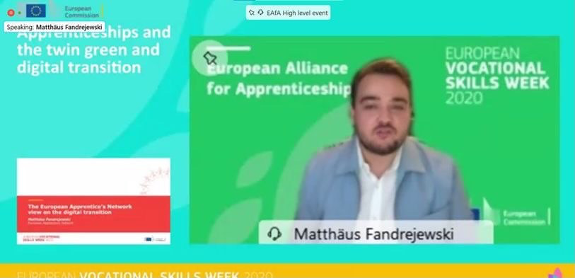 The international climate targets and digitisation are important drivers of far-reaching changes in the labour market of the future. Matthäus Fandrejewski is convinced that “digital competence and the ability to use resources in a sustainable manner will shape many job profiles“. Matthäus Fandrejewski, founding member of the European Apprentices Network and CESI Youth Representative, took part in this year’s European VET Week, which was held online from 9 to 13 November. Matthäus call for a reorientation of vocational education and training towards the metatrends digitalisation and sustainability.